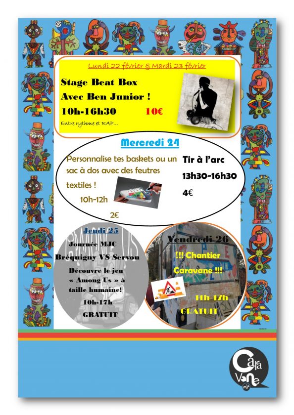 La CARAVANE MJC fait sa grande rentrée !!! Les inscriptions sont ouvertes, n’hésitez pas à venir au secrétariat dès à présent. -> Le programme complet -> La fiche d’adhésion FORUM DES ASSOCIATIONS – Samedi 5 septembre Nous serons tous présents pour vous accueillir dès samedi matin 9h30, salle Brassens. N’oubliez pas votre masque. Petit rappel pour les parents ayant demandés le pédibus : pouvez-vous, par retour de ce mail, nous dire dans quelle école se trouve votre enfant (école privée, école publique // la classe + le nom de l’instituteur-trice), afin que nous puissions les récupérer plus facilement. RETOUR EN IMAGES DES CAMPS DE VOS ADOS : Tout public // Familles et jeunes – LE VENDREDI 11 SEPTEMBRE à 19h – apéro offert Venez participer à notre belle soirée de retour en images des 2 camps d’été, autour d’un apéro offert par la MJC. Y a de quoi se marrer ! LES VAGABONDS DECONFINES : Tout public // DU 25 au 27 septembre – Voir le programme Le festival Vagabondages et compagnie a été annulé en mai 2020 pour cause de COVID. Nous nous sommes mobilisés pour vous proposer un vagabond déconfinés les 25, 26 et 27 septembre. Au programme, théâtre, musique, spectacles de rue, et randonnée. Dans le cadre du protocole sanitaire actuel, nous souhaitons que vous vous inscriviez à chacun des spectacles proposés.