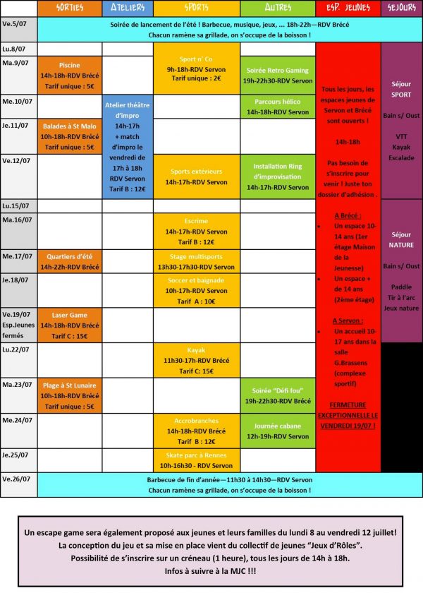 INFOS ANIMATIONS – OCTOBRE 2019 Lundi 21 octobre Tournoi de pétanque : dans le cadre du téléthon, tournoi en présence de l’association des boulistes de Servon ! Prévoyez votre jeu de boules ! Lundi 21 et mardi 22 Stage multisports : tenue de sport impérative !! Mardi 22 octobre Opération zéro déchet : Collecte de déchet dans tous Servon – Prévoir son pique nique Mercredi 23 octobre Visite de l’exposition au 3 CHA : visite des oeuvres de Cédric Verdure + atelier créatif Mercredi 23 octobre Poker : soirée organisée par le collectif Jeux d’rôles – Prévoir pique nique Jeudi 24 octobre Opération déco hall : on redécore le hall du complexe sportif ! Jeudi 24 et vendredi 25 Stage vidéo : dans le cadre des stages passerelles avec l’ALSH Arlequin. Réalisation d’un projet autour de la vidéo avec Sonodrone : tournage, effet spéciaux avec écran vert, montage vidéo… Repas prévu pour les jeunes inscrits au projet. Vendredi 25 octobre Patinoire : au blizz à Rennes – Prévoir tenue de sport chaude + gants Lundi 28 octobre Création d’un évènement intercommunal : à Domloup. On part à la rencontre des jeunes des communes aux alentours pour imaginer un projet à l’échelle intercommunale. Prévoir pique nique. Lundi 28 octobre Journée VTT : on fixe notre parcours ensemble et on part en vélo ! Prévoir pique nique, vélo et casque obligatoire !! Mardi 29 octobre Skate parc hangar : à Nantes. Prévoir pique nique, roller/skate/trotinette, casque obligatoire !! Atelier construction salon de jardin : atelier famille (les parents, grands parents, frères et soeurs sont les bienvenus !) Mardi 29 et mercredi 30 Atelier construction salon de jardin Jeudi 31 octobre Installation de la Nuit des sports Prévoir systématiquement un goûter et de l’eau Le lieu de rendez vous est le complexe sportif -> Télécharger la fiche d’inscription