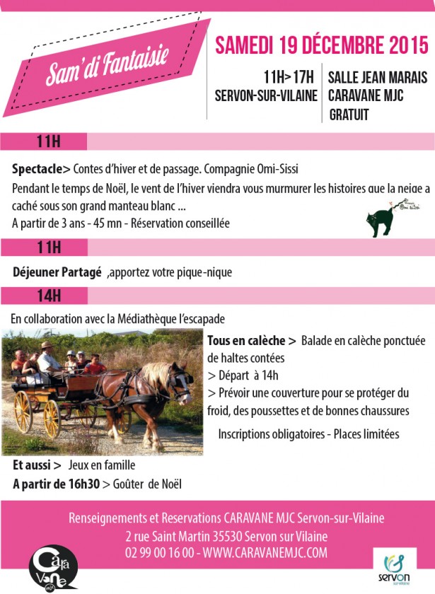Samedi 19 décembre 2015 11h>17hSalle Jean Marais Servon-sur-vilaine Caravane MJC GRATUIT 11h Spectacle> Contes d’hiver et de passage. Compagnie Omi-Sissi Pendant le temps de Noël, le vent de l’hiver viendra vous murmurer les histoires que la neige a caché sous son grand manteau blanc … A partir de 3 ans – 45 mn – Réservation conseillée 12h Déjeuner Partagé ,apportez votre pique-nique 14h En collaboration avec la Médiathèque l’escapade Tous en calèche> Balade en calèche ponctuée de haltes contées> Départ à 14h> Prévoir une couverture pour se protéger du froid, des poussettes et de bonnes chaussures Inscriptions obligatoires – Places limitées Et aussi> Jeux en famille A partir de 16h30> Goûter de Noël Renseignements et Reservations CARAVANE MJC Servon-sur-Vilaine 2 rue Saint Martin 35530 Servon sur Vilaine 02 99 00 16 00 – www.caravanemjc.com