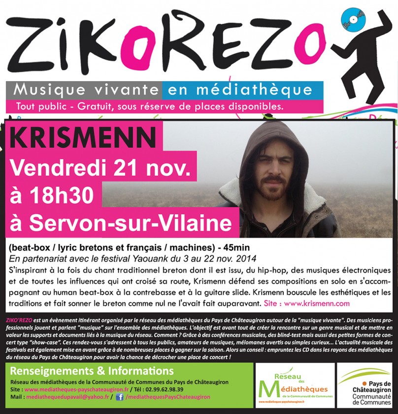 (beat-box /lyric bretons et français / machines) – 45min En partenariat avec le festival Yaouank du 3 au 22 nov. 2014 S’inspirant à la fois du chant traditionnel breton dont il est issu, du hip-hop, des musiques électroniques et de toutes les influences qui ont croisé sa route, Krismenn défend ses compositions en solo en s’ accompagnant au human beat-box à la contrebasse et à la guitare slide. Krismenn bouscule les esthétiques et les traditions et fait sonner le breton comme nul ne l’avait fait auparavant. Site : www.krismenn.com