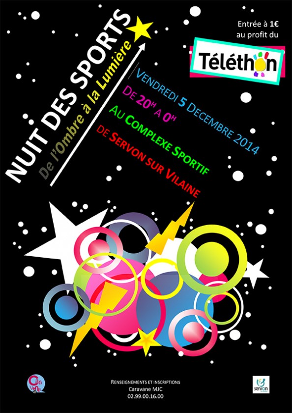 De 20h à minuit, venez découvrir des pratiques sportives dans le noir, avec lumières phosphorescentes! Tarif: 1€ reversée au profit du TELETHON Complexe sportif Servon sur Vilaine