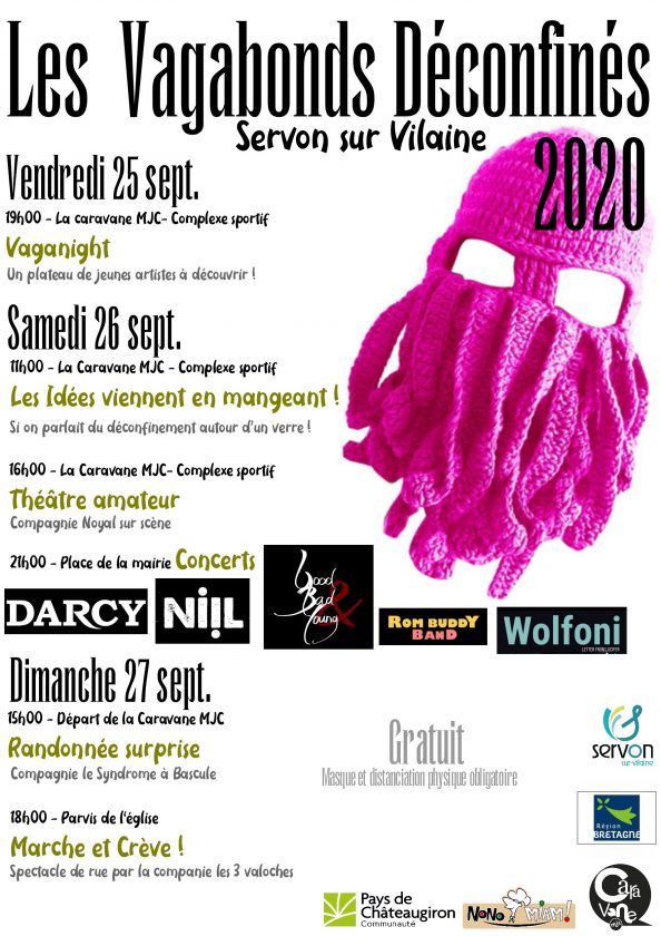 Bonjour à toutes et à tous, cette année, nous avons la chance de pouvoir vous présenter la nouvelle édition des Vagabondages & Compagnie, édition 2021. Retrouvez ici tout le programme en détail. Les animations se faisant à l’extérieur, nous serons contraints de les annuler en cas d’intempéries. Protocole sanitaire Inscription obligatoire pour listing participants, accueil en extérieur, circuit de circulation, pas de mouvement des publics, installation cabaret (6 personnes assises autour de tables espacées de deux mètres minimum), port du masque, gel hydro-alcoolique GOUTTIERE Cie Illustres Enfants Justes (marionnettes) – Mercredi 19 mai à 11h au Complexe sportif / Servon-sur-Vilaine Maternelle/5€, accompagnateur/ gratuit THE COMIC SHOW Cie Primitif (danse urbaine) – Mercredi 19 mai à 15h00 au complexe sportif/ Servon-sur-Vilaine Primaire/5€, accompagnateur/gratuit DUO CATHAM (duo Harpe & Percussions) – Jeudi 20 mai à 15h00 à la Maison Héléna/ Servon-sur-Vilaine Tout public / gratuit BIKINI GORGE (Rock garage) – Vendredi 21 mai à 17h00 TRANSFERE A LA COINTERIE au complexe sportif/ Servon-sur-Vilaine Tout public / gratuit SAMEDI 22 MAI ARMELLE LA CONTEUSE (conte) – 11H à la médiathèque de Servon-sur-Vilaine Tout public / gratuit FABRICONTEUSE (conte pour adultes) – 11h Place de l’Europe / La Bouexière Adultes/ Gratuit Après une semaine de résidence à la Caravane MJC en octobre 2020, Julie la Fabriconteuse vous propose de découvrir son travail… Ce spectacle s’appuie sur du théâtre d’objets et de terre manipulée. Nous sommes conduits au Québec, dans la hutte d’un vieil homme, un homme médecin. Cet homme va raconter sa vie à un enfant, il va lui dire aussi tous les abus qu’il a subis, et lui expliquera surtout son chemin de guérison. Ainsi, il va permettre, à l’enfant de rencontrer les esprits des animaux qui pourront l’aider à guérir, à son tour… INVITE SURPRISE (musique) – 12h Place de l’Europe / La Bouexière Tout public / gratuit KEST’EN SEXE (jeu) – à partir de 10h AU COMPLEXE SPORTIF / Servon-sur-Vilaine Ados / Adultes / Pros / gratuit 10h-10h45 – adultes / 10h45 – 11h30 – professionnels éducatifs / 11h30 – 12h15 – ados de + 14 ans Initiation au jeu Kest’en sexe, créé par les MJC du 35, autour de la vie affective et des sexualités chez les jeunes. Des questions, des quizz à expérimenter ensemble… POUCE UN OISEAU PASSE Cie Tra le Mani (théâtre, récit) – 11h à La chambre d’hôtes La Métairie / Domloup +14 ans / 5 € « CE N’EST PAS DU THEATRE, PRECISE JOËL JOUANNEAU, C’EST UN MOMENT D’HUMANITE » Ce travail est la mise en parole de deux ans d’errance nourries de rencontres, de lectures, et de réflexions, tant philosophiques que poétiques. Résumé : Né en Bretagne, dans un milieu ouvrier, Patrice a vécu à Paris dans un environnement majoritairement intellectuel et artistique. Mais en juin 2015, quand son appartement prend feu, il se retrouve seul dans les décombres, face à lui-même. Deux années d’errance suivent alors. Elles le conduisent à rencontrer des personnes contraintes à l’exil et à rouvrir les yeux sur nos existences. Peut-être sommes-nous de simples oiseaux de passages ? ANNULE // CONTEST AU SKATE PARK (PENTAGON TRANSFERE A LA COINTERIE à SERVON SUR VILAINE) – de 16h à 18h30 / Servon-sur-Vilaine A partir de 10 ans / gratuit / casque obligatoire 14h- 16h15 : Stage d’initiation et de perfectionnement freestyle – à partir de 10 ans – tous niveaux – sur inscription* – 14h-14h45 : stage de skateboard – 14h45-15h30 : stage de roller street – 15h30-16h15 : stage de trottinette freestyle 16h30 : Contest en Jam Session (Trottinette, skate & roller) avec la présence et participation de la team 9dot8 ! – sur inscription* En exclu : la participation d’Etienne Marechal – Plusieurs fois Champion de France en roller freestyle Brandon Huynh – Parmi les meilleurs trottiriders de Rennes Et bien d’autres… *Inscriptions dès à présent auprès de Johanna 06 22 27 36 65 ou dès 14h samedi 22 mai au skate park. Etienne Maréchal Tout au long de l’après-midi, retrouvez une ambiance électro avec le collectif Pentagon (DJ) / TRANSFERE A LA COINTERIE A SERVON SUR VILAINE. ANNULE // AU VILLAGE FAMILLE – SAMEDI 22 MAI de 16H A 18H30 au complexe sportif / TRANSFERE A LA COINTERIE / Servon-sur-Vilaine Tout public / gratuit ANNULE // LES VEILLEURS AU GRAIN (initiation théâtre) – de 14H A 18H au complexe sportif / Servon-sur-Vilaine Tout public / gratuit Initiation* théâtre +6 ans /adultes – 2 sessions (10 pers max) : rdv à 14h30 / rdv à 16h (initiation de 45 minutes) Venez partager un temps ludique et convivial avec les comédien.ne.s. Cet atelier parent/enfant sera l’occasion de découvrir par des jeux simples le plaisir de faire du théâtre ensemble. * sur inscription auprès de Audrey de préférence par mail caravanemjcenfancefamille@gmail.com ou au 06 23 08 08 00 ELLE B & LEKI (chanson RNB) – à 16h au complexe sportif TRANSFERE A LA COINTERIE / Servon-sur-Vilaine Tout public / gratuit Dimanche 23 mai CRIEUSE DE RUE ! ça va être tout noir !!! Cie LES FILLES DU LARGE (danse contemporaine) – 10H30 et 12H00 au marché de Servon-sur-Vilaine Tout public / gratuit FONKYVEL (funk) – 11h au marché de Servon-sur-Vilaine Tout public / gratuit RANDONNEE SURPRISE – Départ à 13h de la MJC Tout public / 2 € ANATOLE (musique swing) – 17h sur le parvis de la Mairie Tout public / gratuit