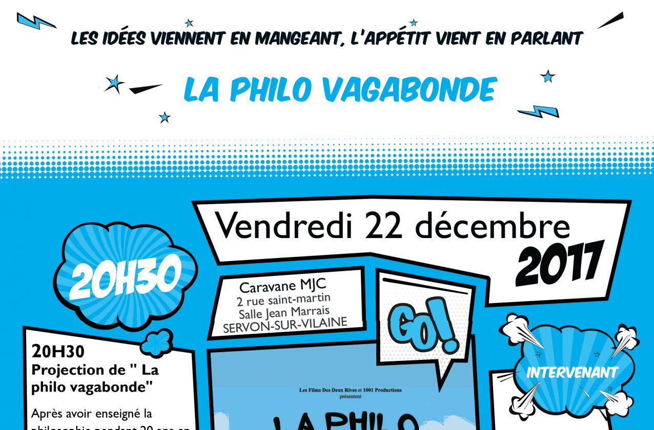 Soirée « les idées viennent en mangeant, l’appétit vient en parlant » à la Caravane MJC – Servon sur Vilaine 20h30 Projection de » la philo vagabonde » En philosophe « forain », toujours sur les routes, Alain Guyard mène un combat pacifique mais pas inoffensif, où s’élabore sans cesse de l’intelligence collective : mettre la philosophie dans tous ses états et la ramener à sa dimension charnelle, dérangeante, dans des lieux inattendus, en plein champ, en prison ou au fond d’une grotte, et au plus près des plus humbles, des simples citoyens. Puis discussion autour d’un buffet de produits locaux avec le réalisateur, Yohan LAFFORT. Prix libre avec participation au buffet Réservation conseillée Caravane MJC 2 rue Saint Martin – Servon-sur-Vilaine 02. 99. 00. 16. 00.