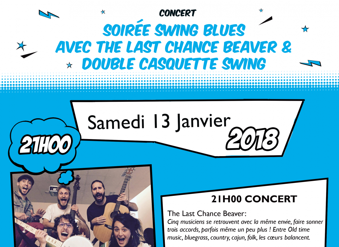 Concert Swing Blues à la Caravane MJC – Servon sur Vilaine Samedi 13 janvier 2018 à 21h00 The Last Chance Beaver : Cinq musiciens se retrouvent avec la même envie, faire sonner trois accords, parfois même un peu plus ! Double casquette swing: Quatuor Rennais composé d’une guitare manouche, d’une contrebasse d’une trompette et d’un violon. Tarif: 7€ Réservation conseillée Caravane MJC 2 rue Saint Martin – Servon-sur-Vilaine 02. 99. 00. 16. 00.