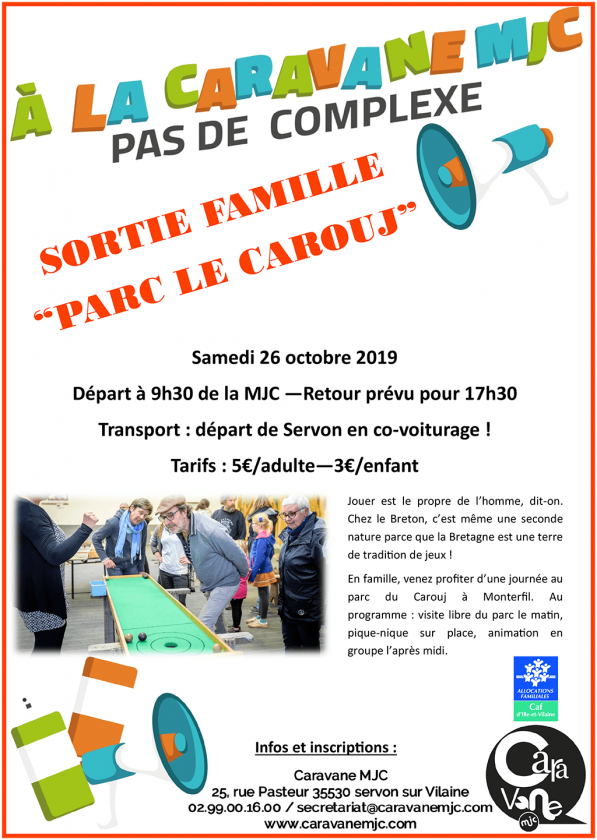 INFOS ANIMATIONS – OCTOBRE 2019 Lundi 21 octobre Tournoi de pétanque : dans le cadre du téléthon, tournoi en présence de l’association des boulistes de Servon ! Prévoyez votre jeu de boules ! Lundi 21 et mardi 22 Stage multisports : tenue de sport impérative !! Mardi 22 octobre Opération zéro déchet : Collecte de déchet dans tous Servon – Prévoir son pique nique Mercredi 23 octobre Visite de l’exposition au 3 CHA : visite des oeuvres de Cédric Verdure + atelier créatif Mercredi 23 octobre Poker : soirée organisée par le collectif Jeux d’rôles – Prévoir pique nique Jeudi 24 octobre Opération déco hall : on redécore le hall du complexe sportif ! Jeudi 24 et vendredi 25 Stage vidéo : dans le cadre des stages passerelles avec l’ALSH Arlequin. Réalisation d’un projet autour de la vidéo avec Sonodrone : tournage, effet spéciaux avec écran vert, montage vidéo… Repas prévu pour les jeunes inscrits au projet. Vendredi 25 octobre Patinoire : au blizz à Rennes – Prévoir tenue de sport chaude + gants Lundi 28 octobre Création d’un évènement intercommunal : à Domloup. On part à la rencontre des jeunes des communes aux alentours pour imaginer un projet à l’échelle intercommunale. Prévoir pique nique. Lundi 28 octobre Journée VTT : on fixe notre parcours ensemble et on part en vélo ! Prévoir pique nique, vélo et casque obligatoire !! Mardi 29 octobre Skate parc hangar : à Nantes. Prévoir pique nique, roller/skate/trotinette, casque obligatoire !! Atelier construction salon de jardin : atelier famille (les parents, grands parents, frères et soeurs sont les bienvenus !) Mardi 29 et mercredi 30 Atelier construction salon de jardin Jeudi 31 octobre Installation de la Nuit des sports Prévoir systématiquement un goûter et de l’eau Le lieu de rendez vous est le complexe sportif -> Télécharger la fiche d’inscription