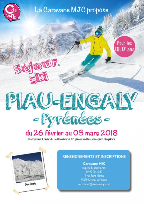 Séjour ski à Piau-Engaly – Pyrénées – lundi 26 février au samedi 03 mars 2018 Inscription à partir du mardi 5 décembre 2017 Une priorité sera donnée aux jeunes n’étant jamais partis au ski avec la Caravane MJC. Le séjour pour les 10-17 ans se déroulera à Aragnouet, Piau-Engaly (Parc National des Pyrénées) au centre de l’association sportive Pyrénéenne (www.asp-moudang.fr). Le transport sera assuré par Keolis. Tarif: QF 1 (de 0 à 540) : 390€ QF 2 (de 541 à 840) : 420 € QF 3 (de 841 à 1140) : 450 € QF 4 (de 1141 à 1440) : 480 € QF 5 (de 1441 à +) : 510 € Le tarif comprend tout : hébergement, repas, transport, location ski, forfait, assurances. Les CCAS de Servon et Brécé peuvent attribuer une aide financière. Prendre contact avec Emilie ROYER pour Servon (02 99 04 24 38 // population@ville-servonsurvilainefr) ou Aurore Orrière pour Brécé (02.99.00.10.09). Dates à retenir : Lancement des inscriptions : à partir du mardi 5 décembre Réunion d’information séjour : vendredi 9 février 2018 (l’horaire sera communiquée) Pour les inscriptions : Les dossiers d’adhésion doivent être remis à la MJC pour la saison 2017-2018 Versement de 50% du montant du séjour pour valider l’inscription. Autres informations : Le séjour est co-organisé entre la MJC de Servon sur vilaine, la ville de Chateaugiron et de Chateaubourg. Une action d’autofinancement sera organisée avec les jeunes de Servon et Brécé. Une soirée « retour séjour » sera mise en place avec tous les jeunes du séjour et leurs parents (date et lieu à confirmer). Caravane MJC 2 rue Saint Martin – Servon-sur-Vilaine 02 99 00 16 00
